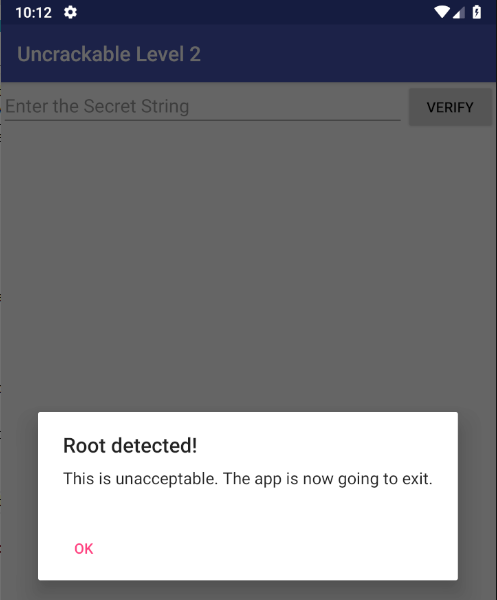 $ frida -U -f owasp.mstg.uncrackable2 --no-pause -l level2.js