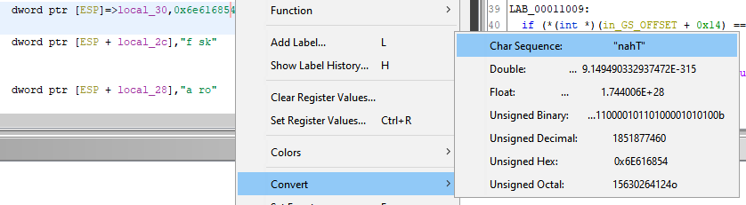 Because we can only enter human-readable text in the app, these must be human-readable text as well. We can see the ASCII value with Ghidra by right-clicking the literal hex values in the disassembly and Convert -> Char sequence: